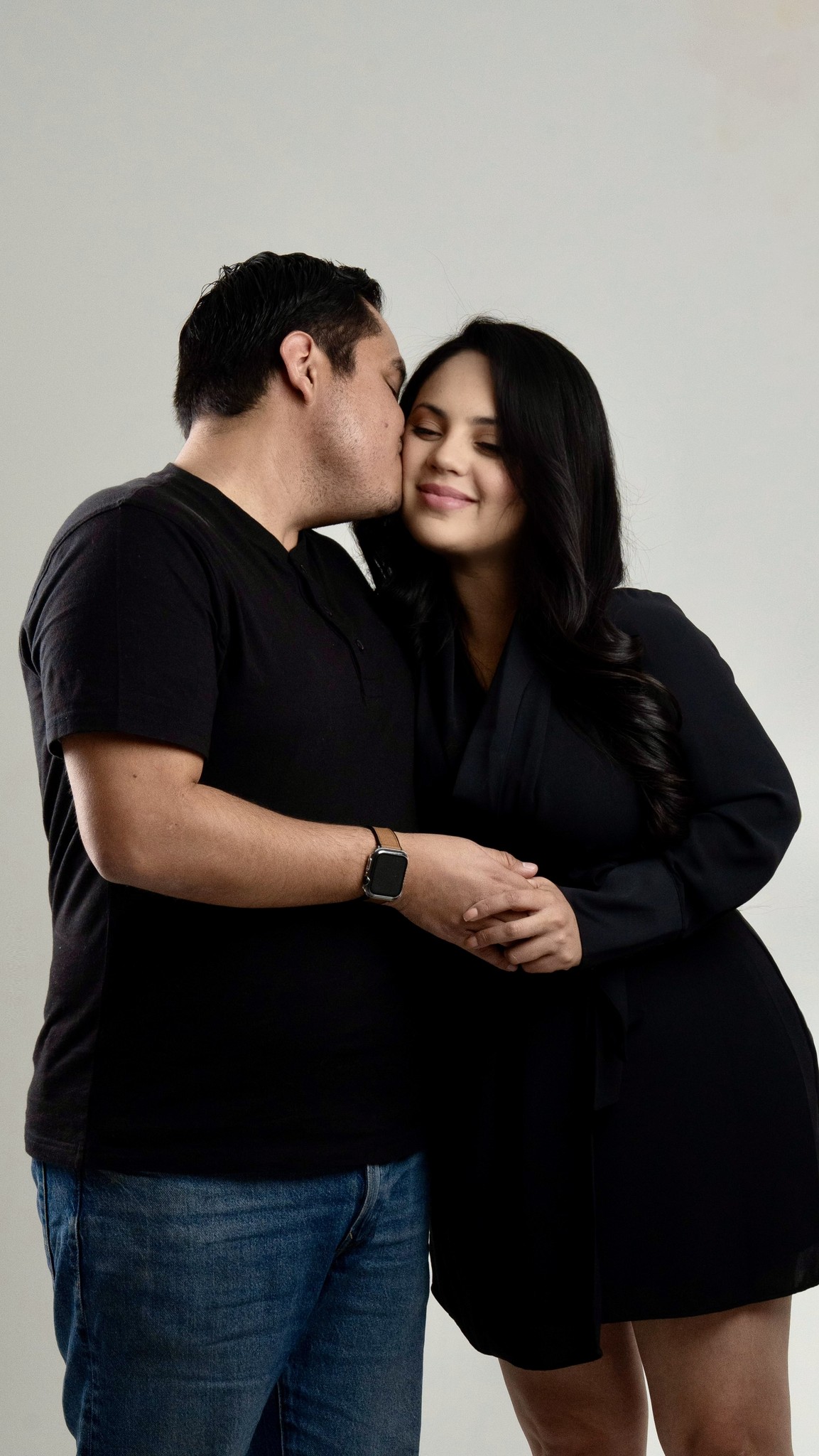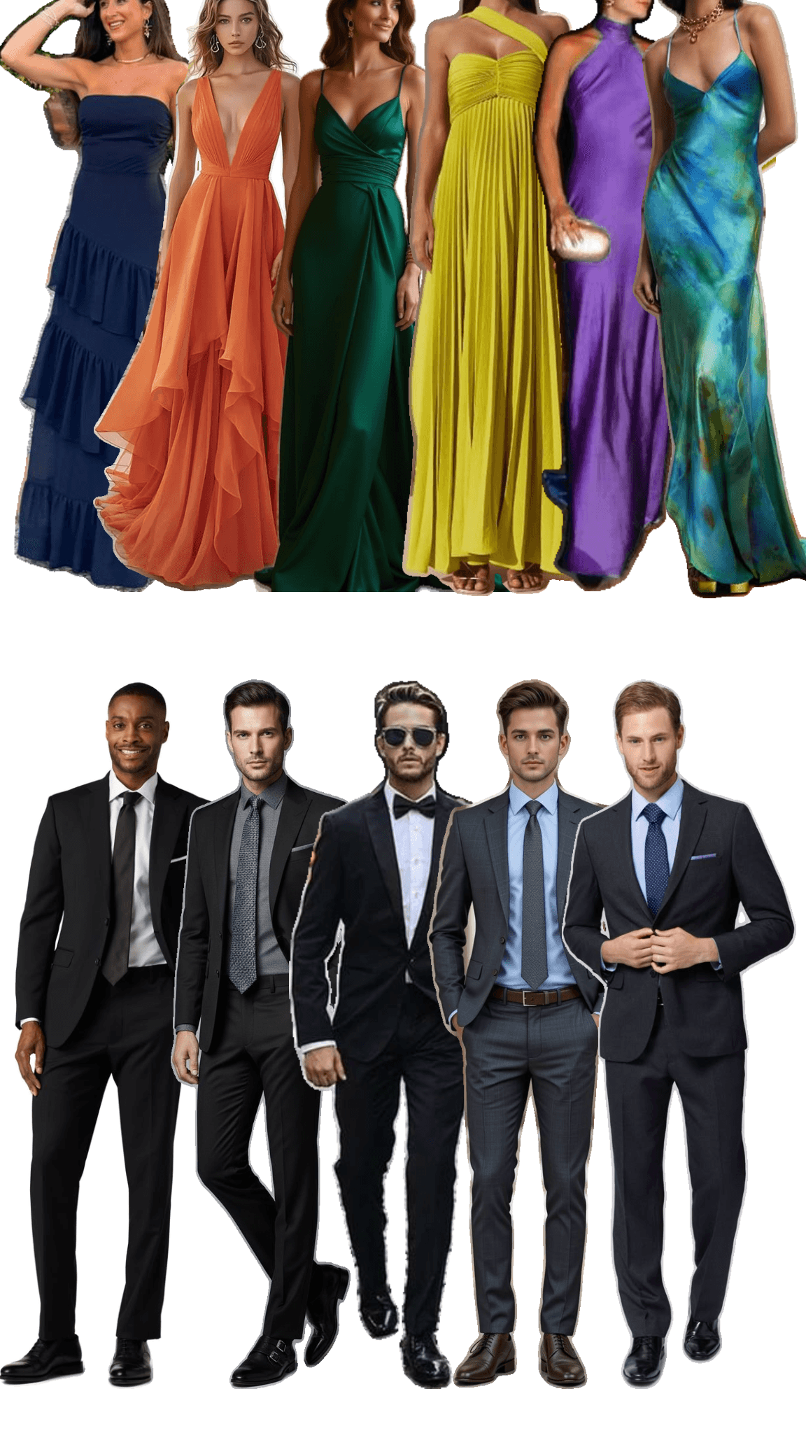 Vestido largo y traje o esmoquin.