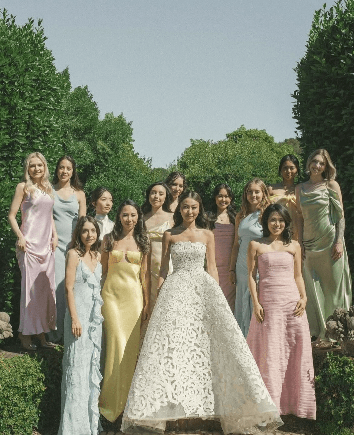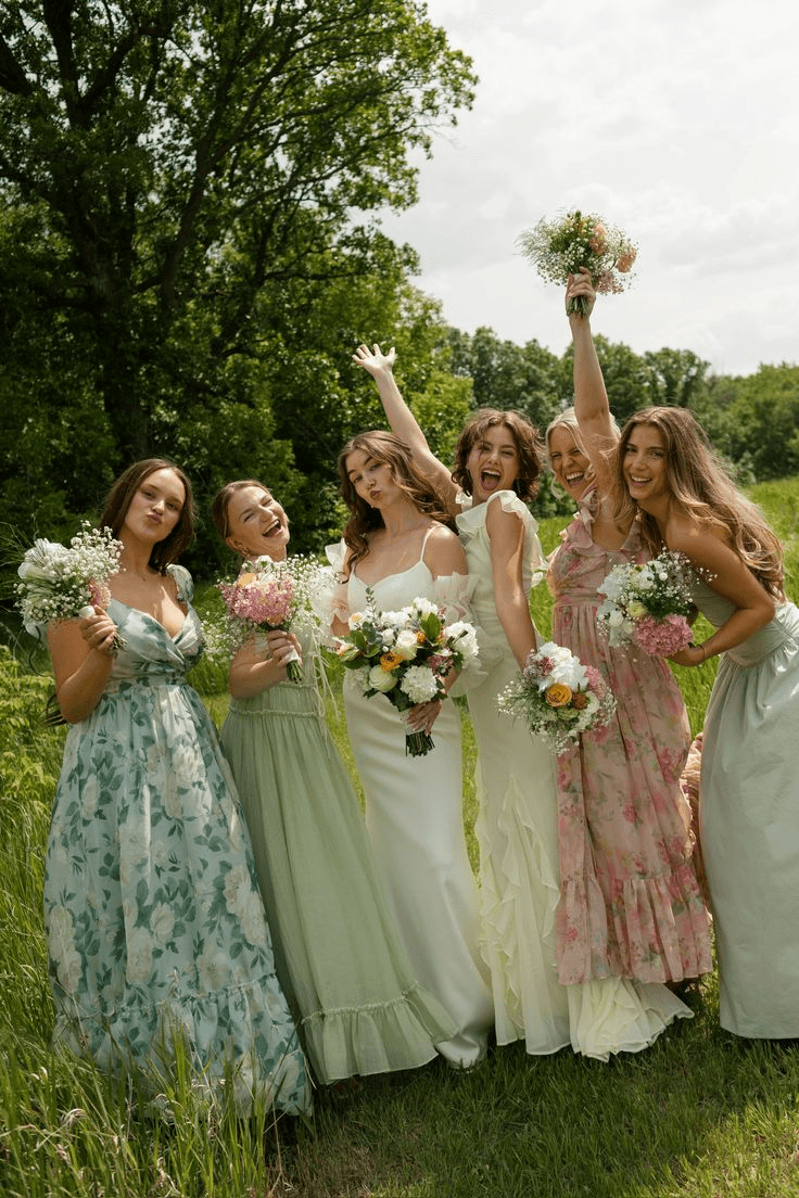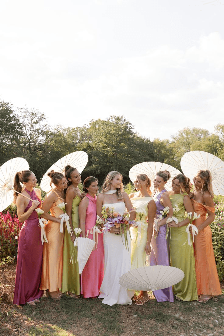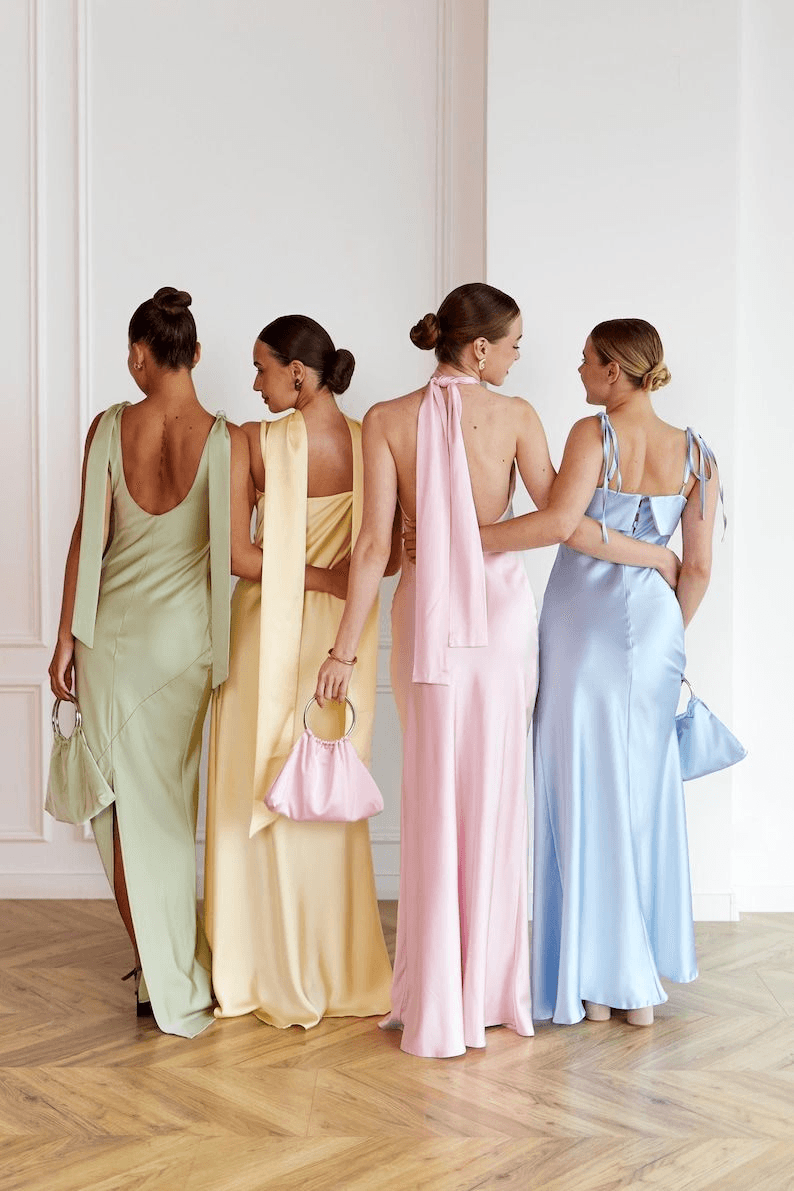 Vestidos largo en color pastel o matices delicados como verde salvia, amarillo mantequilla, rosa, lila, durazno o azul cielo.